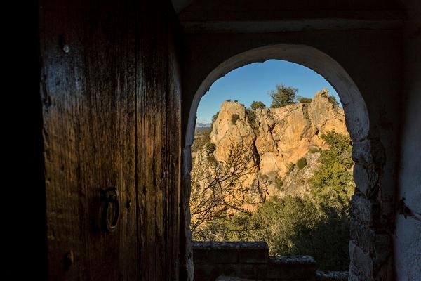 Un coro y un pequeño campanario con espadaña de un ojo se adosan en el muro oeste donde un óculo ilumina el interior, blanqueado y con acceso por una puerta situada al norte. Dentro existe otra pintura de la Virgen del Pilar.